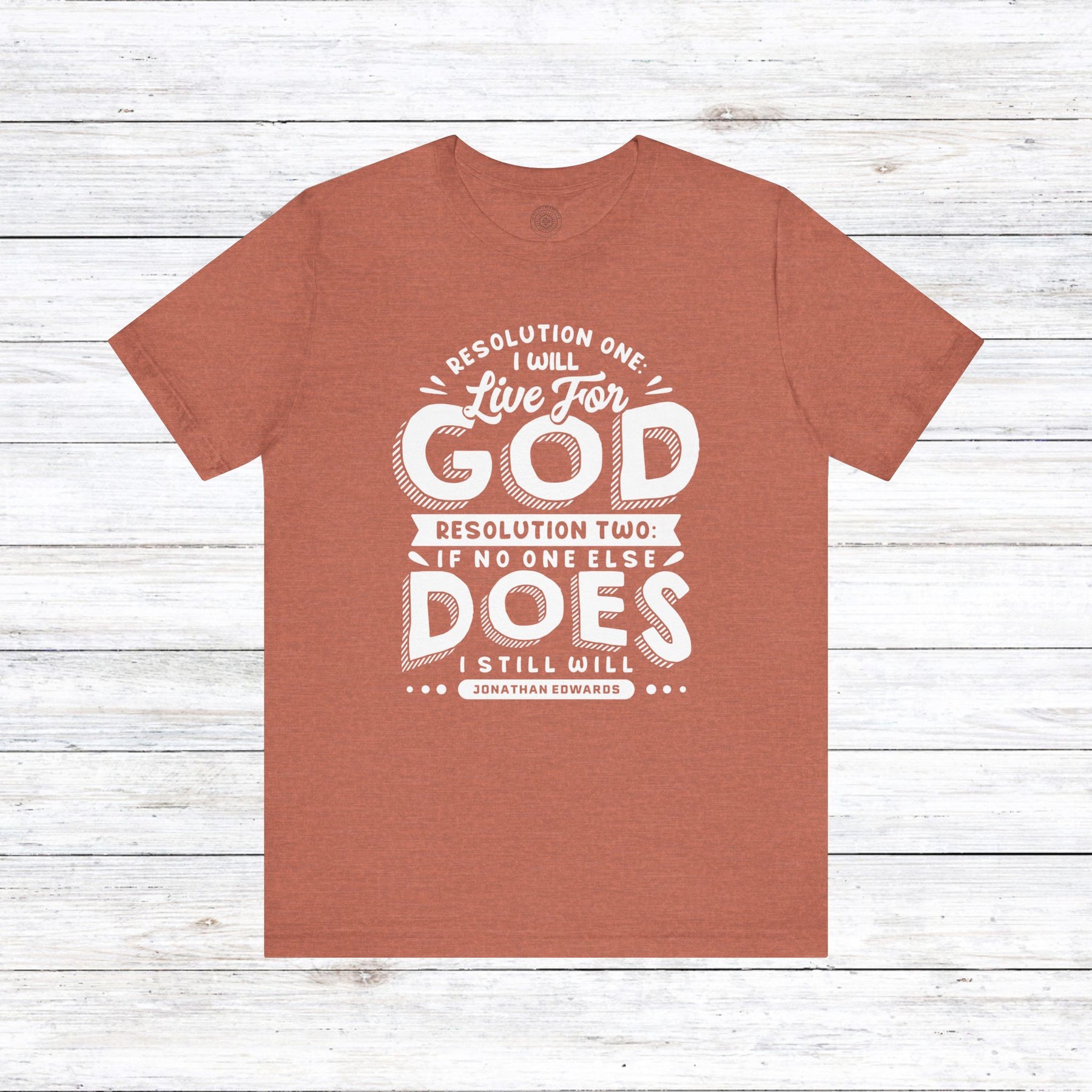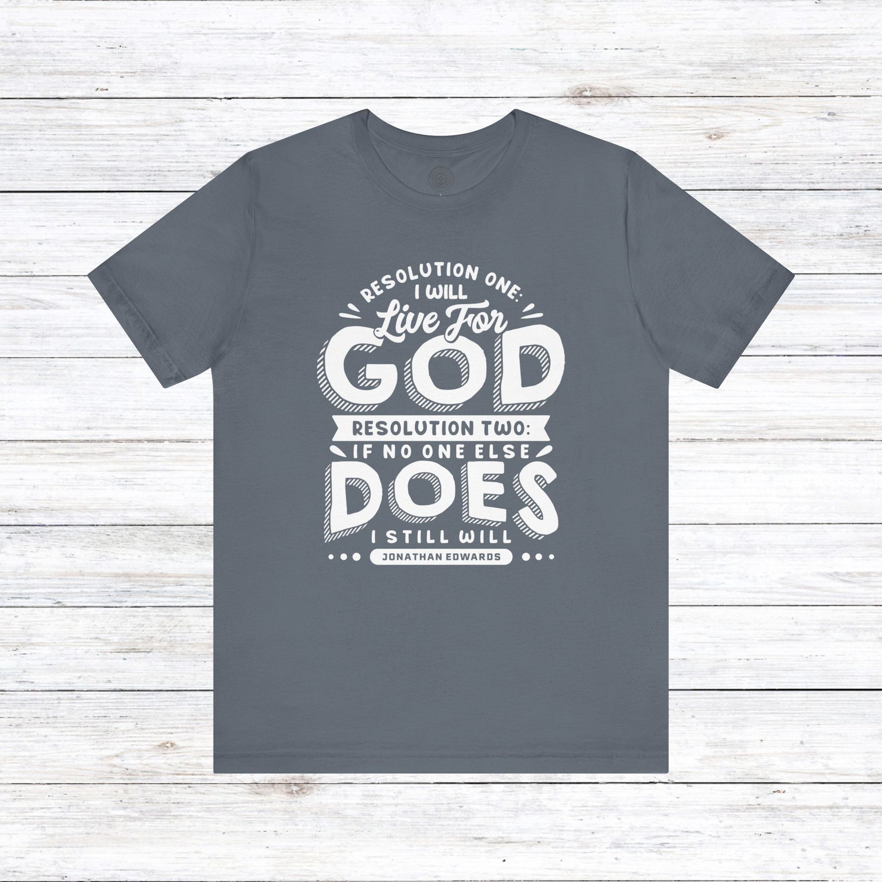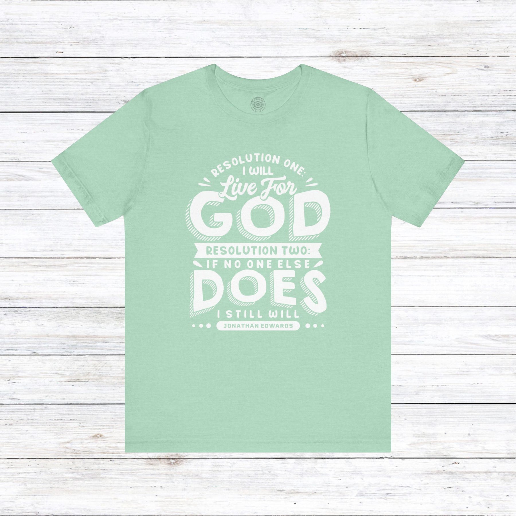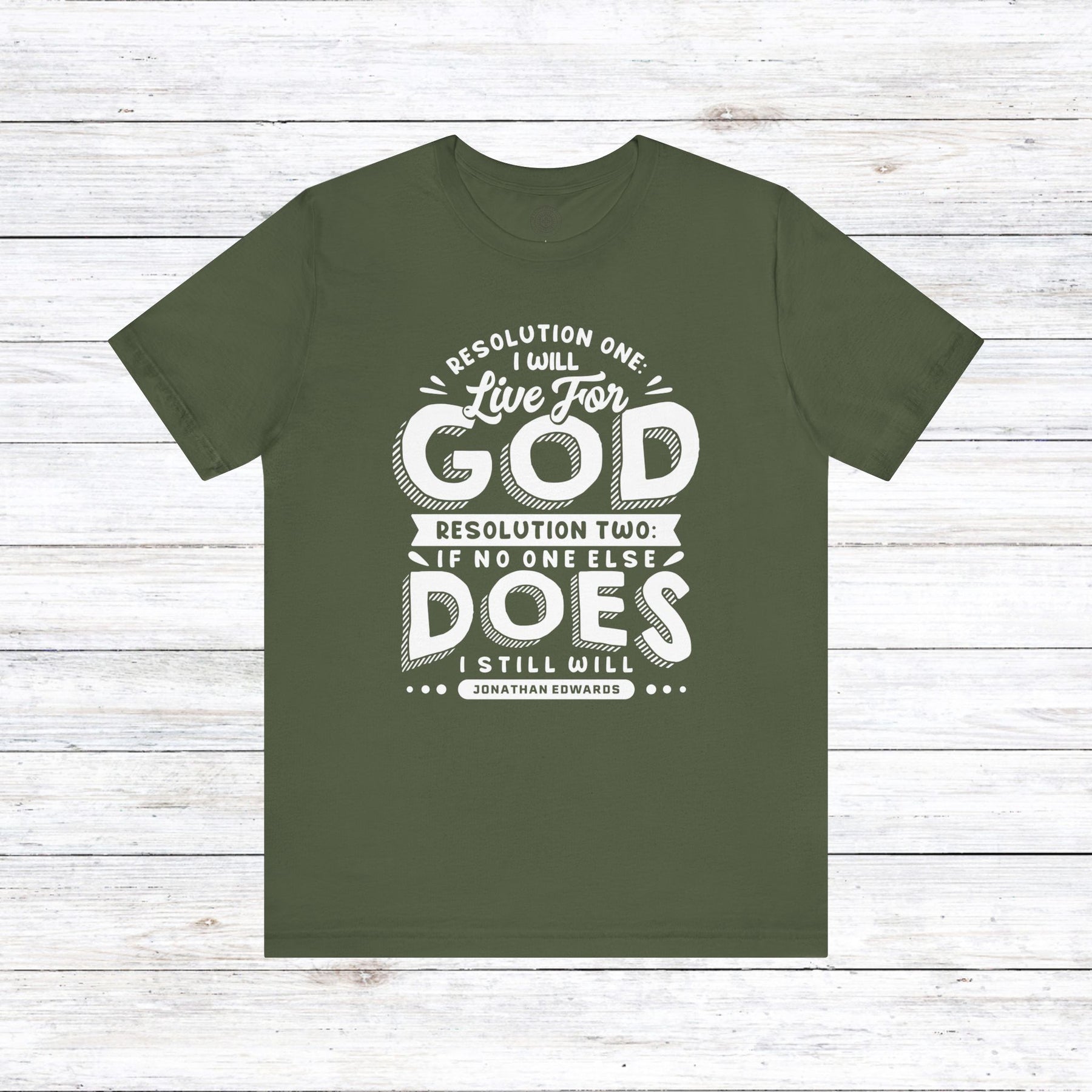 Embrace the unwavering dedication of Jonathan Edwards with our powerful design, featuring his resolute words: “Resolution One: I will live for God. Resolution Two: If no one else does, I still will.”