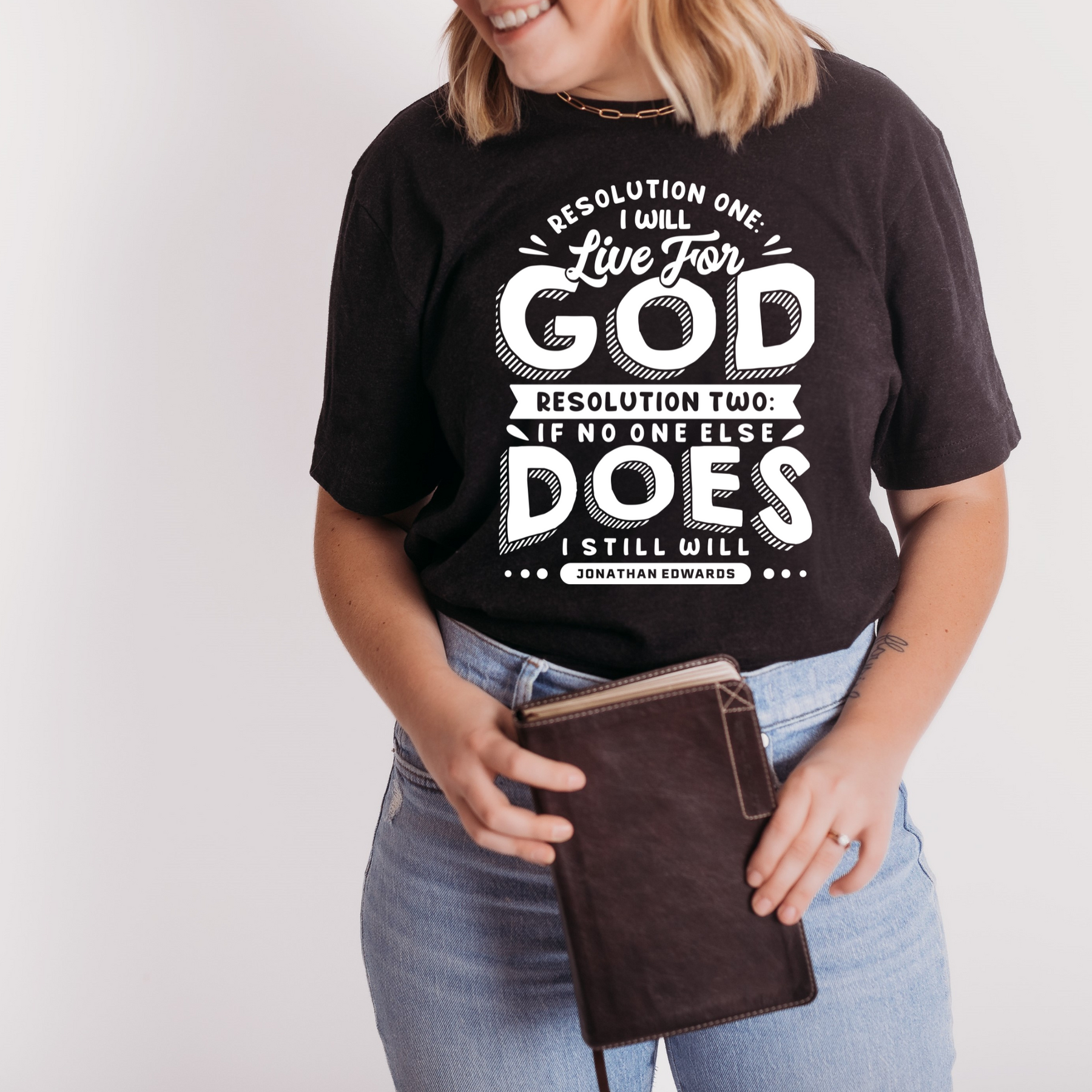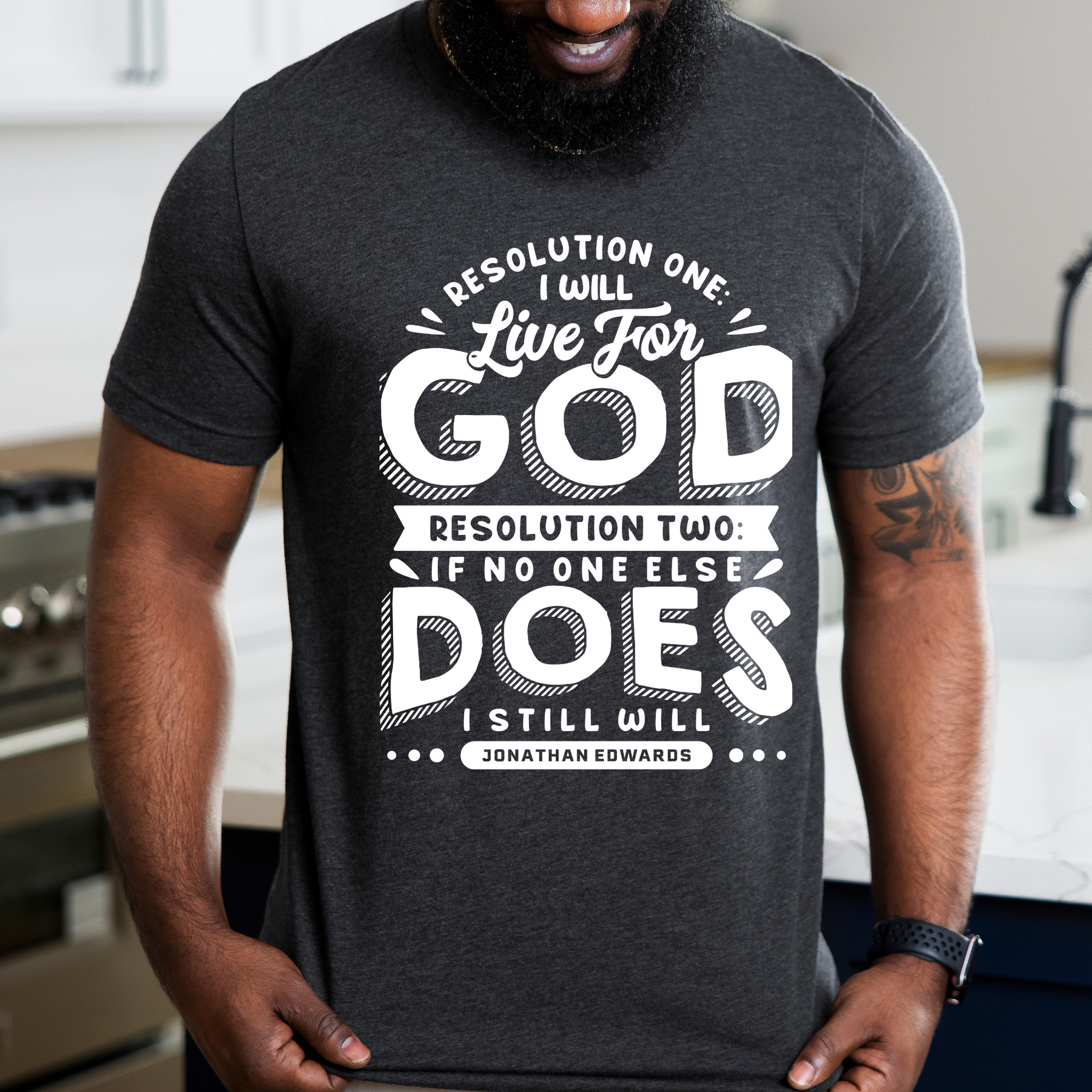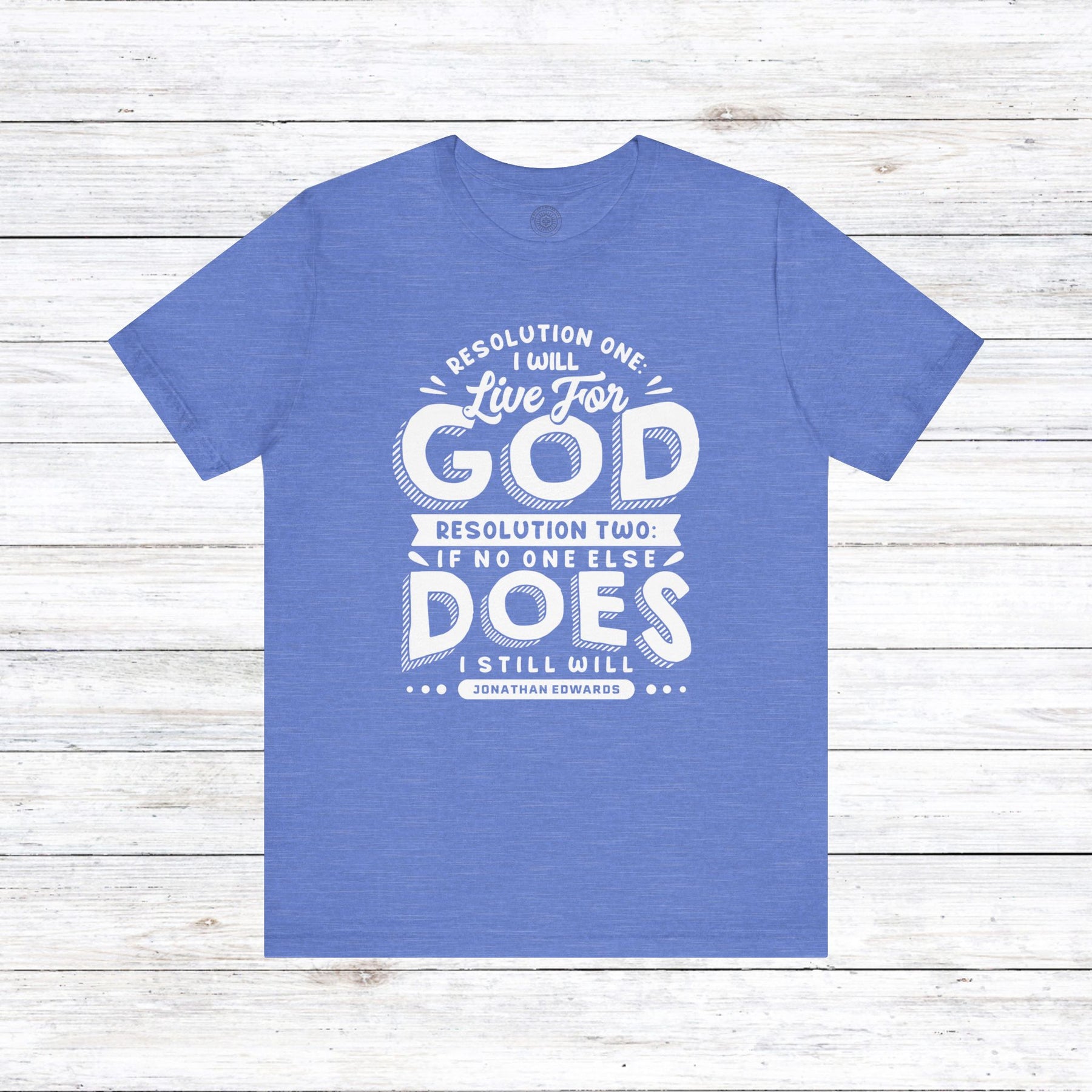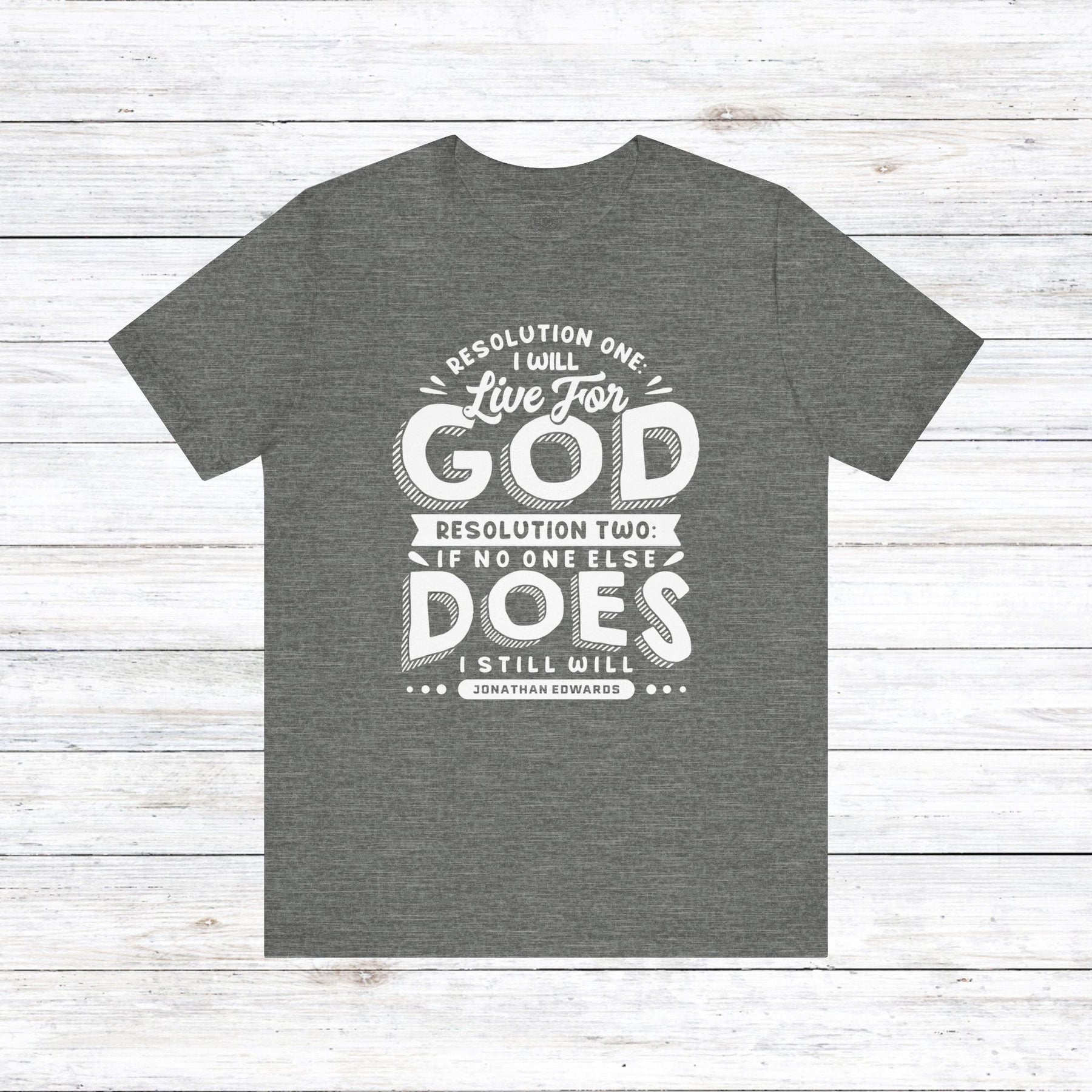 Embrace the unwavering dedication of Jonathan Edwards with our powerful design, featuring his resolute words: “Resolution One: I will live for God. Resolution Two: If no one else does, I still will.”